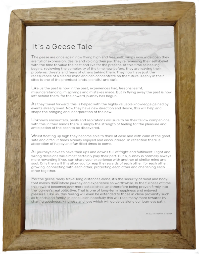 For the geese rarely travel long distances alone, it’s the security of mind and body that makes their whole journey and experience so worthwhile. In the fullness of time this reward becomes ever more established, and therefore being proven firmly into the journey’s real objective. That is one of long-term happiness and enjoyed pleasure. Like us, this feeling will even be extended to those in close proximity such as friends and family. In conclusion hopefully this will reap many more rewards by sharing goodness, kindness and love which will guide us along our journeys path.